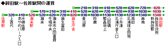 | ○ ○ ○ ○ ○ ● | 北浦庁舎入口 山田橋 繁昌坂上 四鹿 青沼原 麻生庁舎 | 5:13 5:16 5:18 5:23 5:27 5:35 | 7:13 7:16 7:18 7:23 7:27 7:35 | 12:53 12:56 12:58 13:03 13:07 13:15 | 13:53 13:56 13:58 14:03 14:07 14:15 | 12:12 12:09 12:07 12:02 11:56 11:50 | 18:12 18:09 18:07 18:02 17:56 17:50 | 20:12 20:09 20:07 20:02 19:56 19:50 | 21:12 21:09 21:07 21:02 20:56 20:50 | ||
