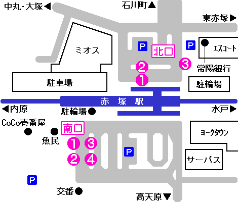 | 北口1番のりば | 茨城交通…水戸駅(石川町経由、東赤塚経由) | |