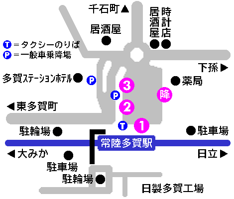 | 1番のりば | 茨城交通 [国道線経由]…神峰営業所、堂平団地、日立駅、山崎工場 [中央線・海岸線経由]…日立駅 | |